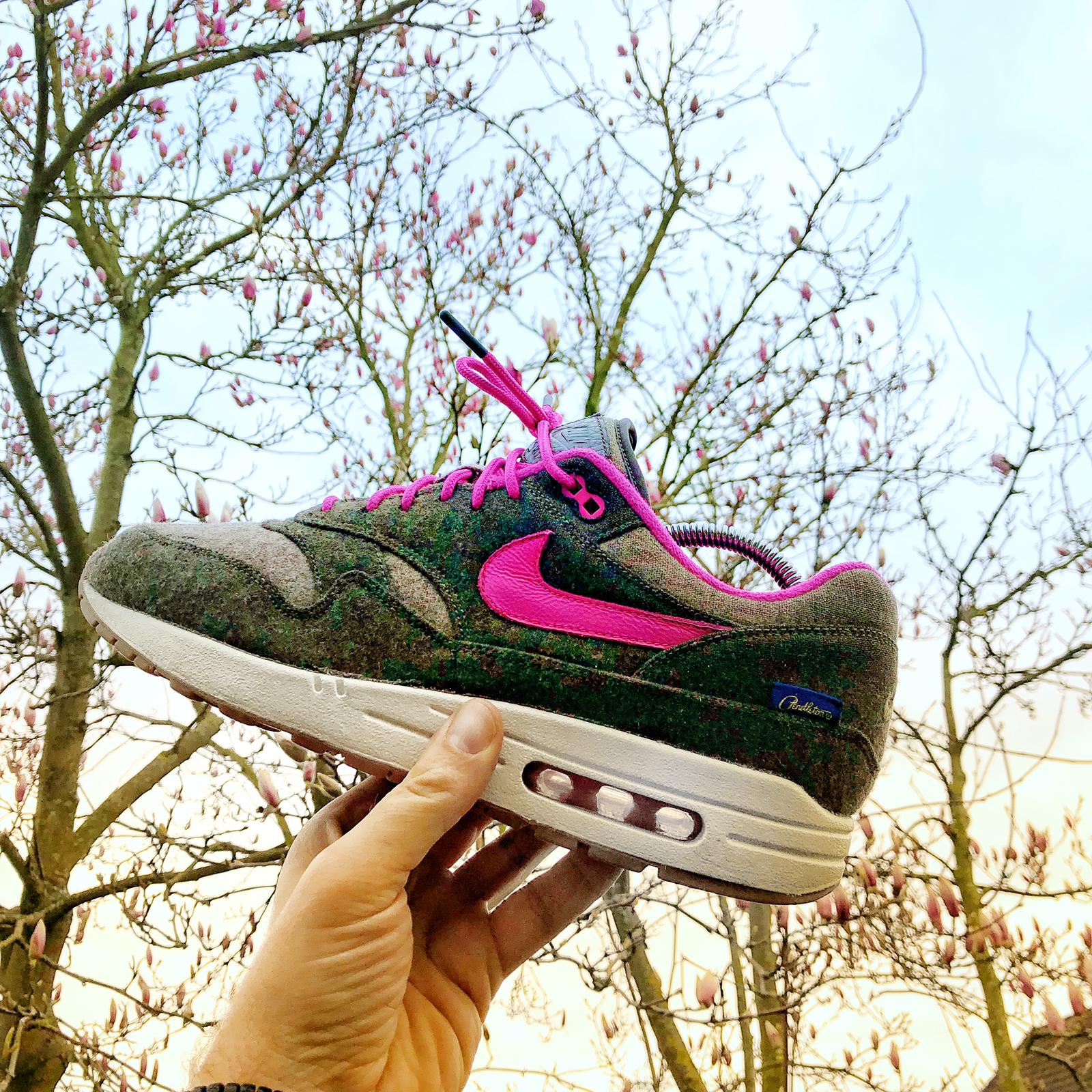„Neben all den genialen Collaborations auf dem Air Max 1 muss ich einfach mal ne Lanze brechen für das wahnsinnige Angebot an Optionen beim ID Pendleton. Die Magnolie im Garten war der Leitgedanke als ich die Farben gewählt habe : Das Filz Upper in braun-grün wie der Baum, die weiße Sohle für die Blüten, der pinke Swosh, das pinke Futter und die pinken Laces spiegeln die Blütenspitzen wieder! Und all das auf ne soliden Gum-Sole! #airmaxlove“